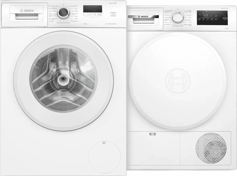 Binnen dezelfde prijsklasse zijn er kleine verschillen tussen sets die belangrijk kunnen zijn, afhankelijk van wat je zoekt. In het middensegment rond de €1.300-1.400 heeft Bosch Serie 8 een capaciteit van 9 kilo voor zowel wassen als drogen, automatische dosering en app-bediening.
