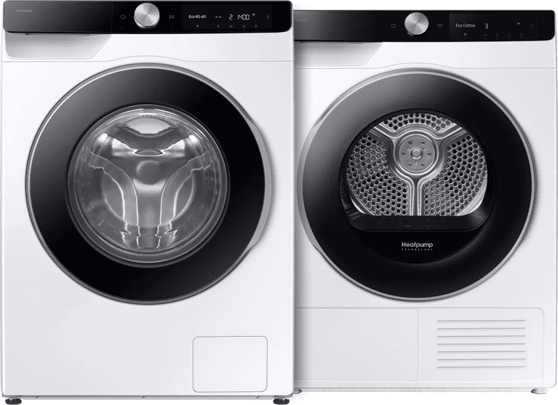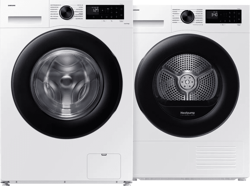 Wat meteen opvalt aan een set van Samsung, is hoe goed de wasmachine en droger bij elkaar passen. Ze zien er strak uit samen, maar werken ook technisch goed samen. Handig als je wilt dat je wasroutine soepel verloopt.